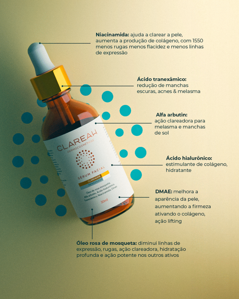 O sérum da CLAREAH DERMOCOSMÉTICOS combina alfa arbutin, ácido hialurônico, ácido tranexâmico, niacinamida, Oléo rosa de mosqueta e DMAE. Estes ingredientes trabalham juntos para clarear a pele, hidratar intensamente, reduzir hiperpigmentação e melhorar a textura, firmeza e elasticidade da pele. É ideal para tratar melasma, manchas de sol, acne e sinais de envelhecimento.